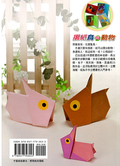 已出版過3本摺紙書的林老師,再以詳實的步驟拍攝,步步示範摺出多種鳥類.兔子.飛天狗.飛魚.昆蟲等25款作品。並浮貼應用於立體卡片.立體海報,或為手作立體書的入門參考。
