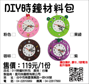 內容物: 彩色說明書,不織布,紙板,時鐘機心組,縫線,配件小飾品(不挑款式)