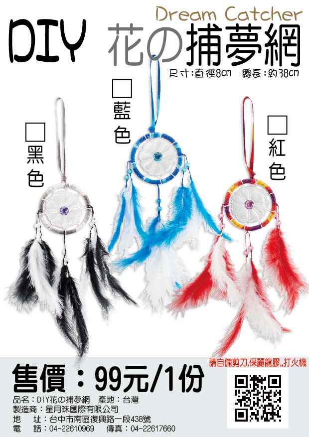 「捕夢網」源自北美印地安蘇族的護身符。通常印地安小孩做惡夢時,父母都會在其床頭上掛一個捕夢網。象徵性地用來抓住惡夢或惡夢中的魔鬼。後來在美國某些地區也流傳著這個風俗,捕夢網是象徵祈求平安;並帶來好運之意義,並可過濾惡夢,捕捉美夢,至於壞的、邪惡的部份,則自然從網心小孔濾出。所以,那是先人遺留下來的智慧,他們會在房子裡頭掛很多,作為裝飾和避邪。 黑色 下單區