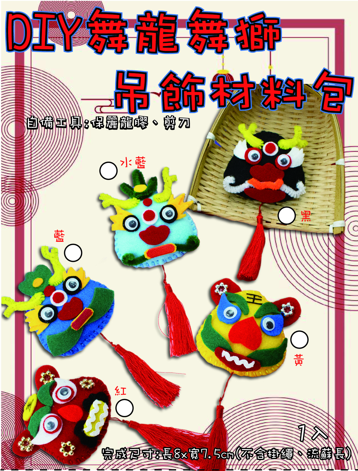 內附彩色說明書、不織布、流蘇、活動眼、毛根、裝飾品